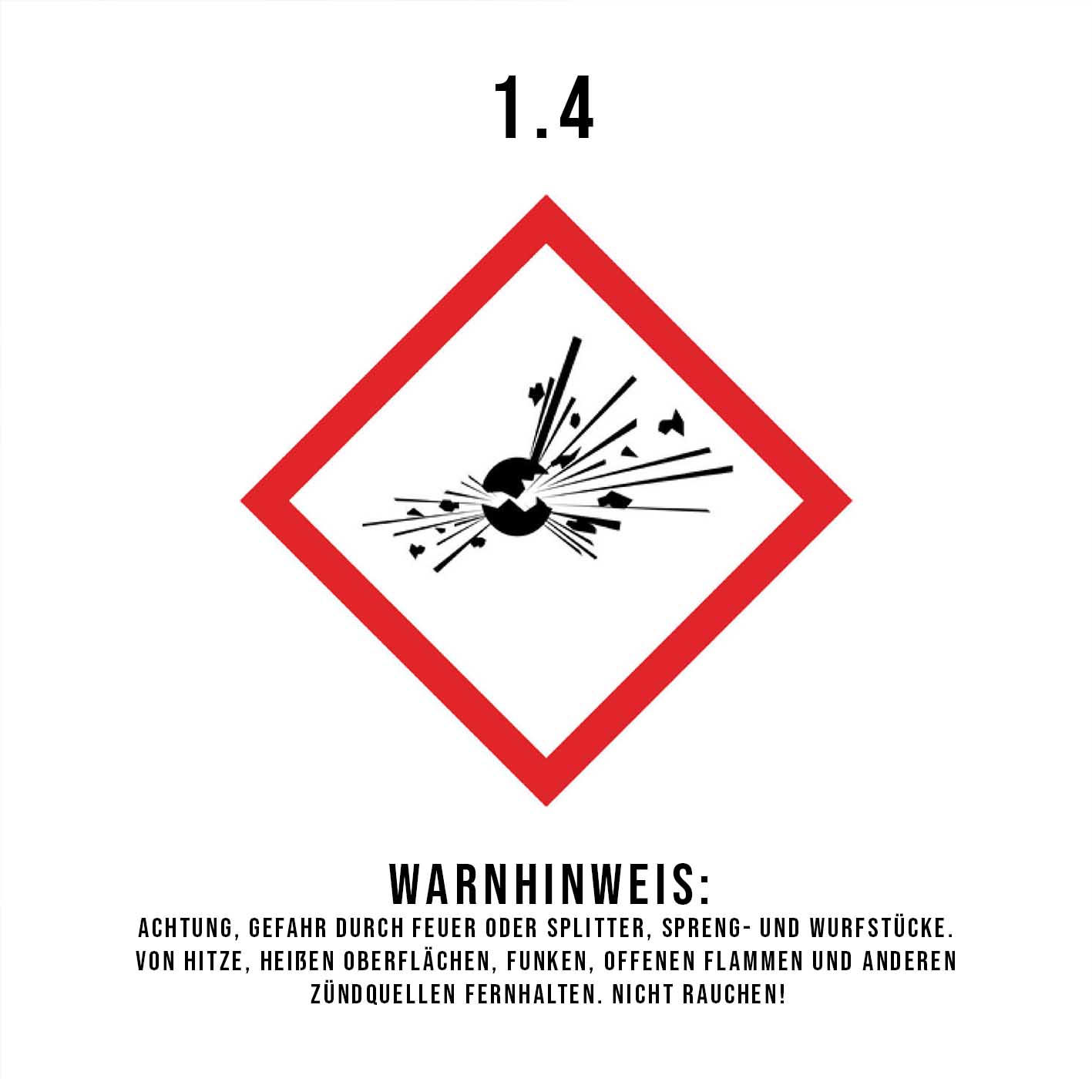 | Warnhinweis: | Achtung, Gefahr durch Feuer oder Splitter, Spreng- und Wurfstücke. Von Hitze, heißen Oberflächen, Funken, offenen Flammen und anderen Zündquellen fernhalten. Nicht rauchen! |